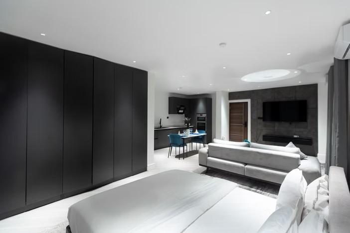 This 667m² Studio Apartment is styled with elegance, with top-of-the-line appliances and fully furnished for your comfort. Every detail has been thoughtfully considered. The 14m² living area opens into a generously proportioned 25m² bedroom space, creating an airy, open-plan layout enhanced by high ceilings and expansive windows that flood the apartment with natural light. Outside is the 13m² private balcony, a tranquil space ideal for morning coffee or evening relaxation. The 13m² kitchenette features premium fittings and top-of-the-line appliances, perfectly suited for both casual dining and more refined culinary pursuits. The 8m² bathroom is finished to an exceptional standard, offering a spa-like atmosphere with designer fixtures and elegant lighting.